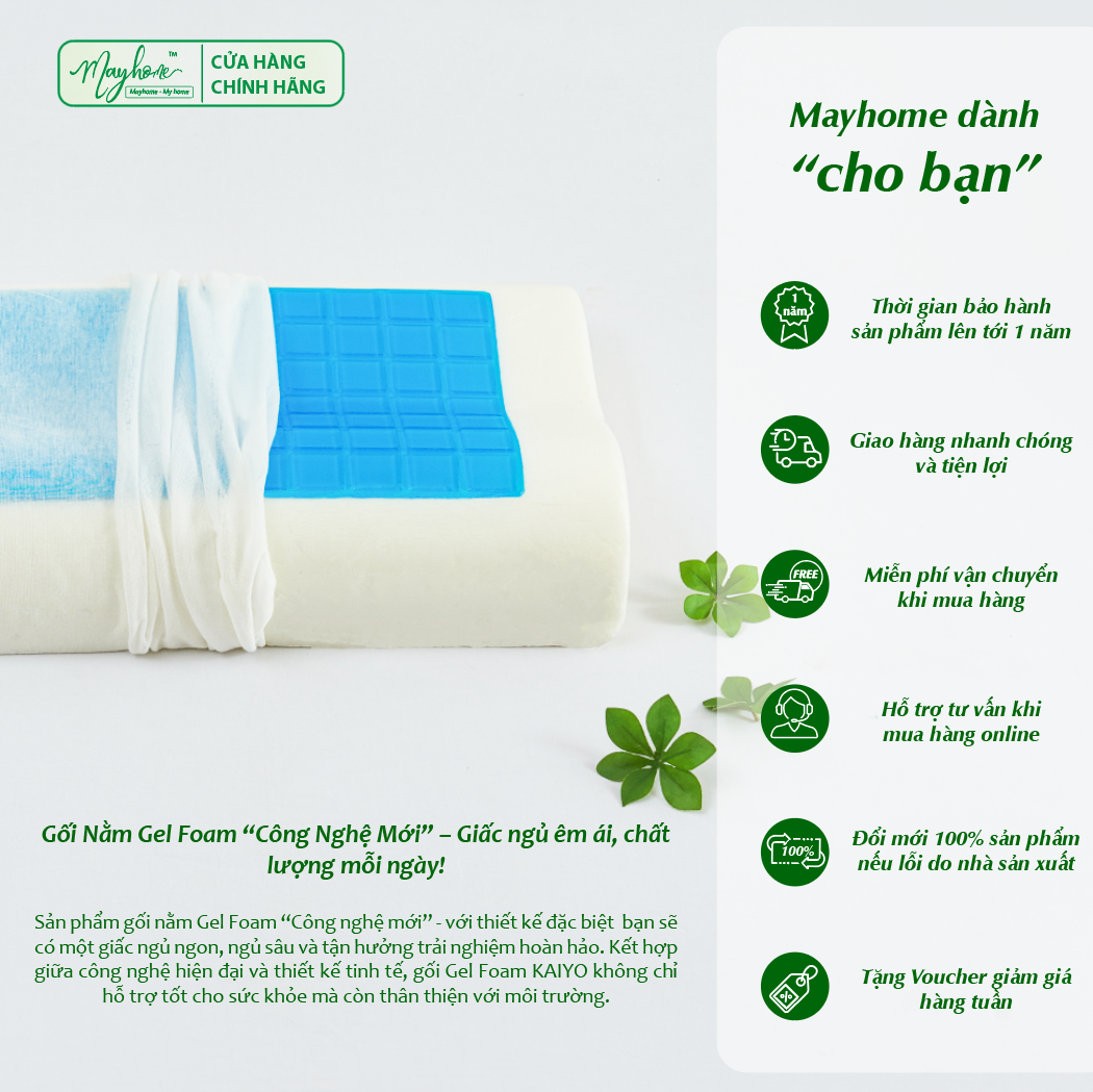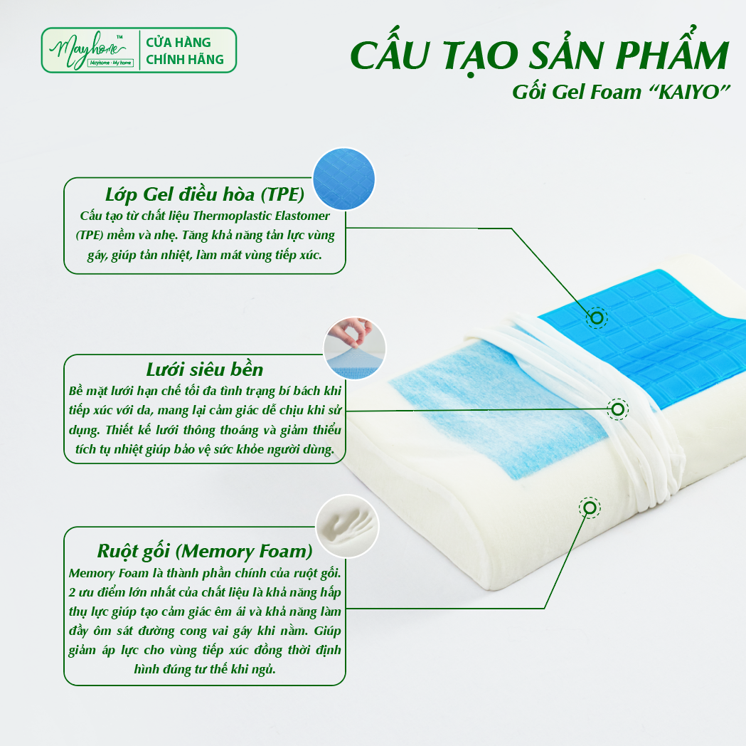 Chất liệu: Ruột gối Foam memory cao cấp, Silicone Gel cân bằng làm mát và Lưới lót 100% Polyester.