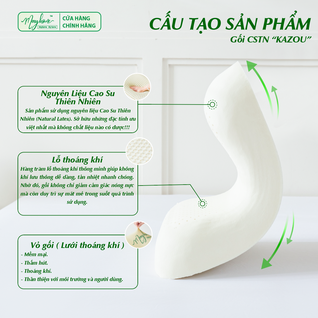 - Thiết kế nguyên khối như những gối cao su thiên nhiên khác. KAZOU là cao su thiên nhiên nguyên khối theo dạng gối thấp, có vòm cong - lõm - kết hợp các lỗ thoáng khí nhằm cố định đốt sống cổ, hai bên vai và đều chỉnh, cân bằng giúp ngủ đúng tư thế.