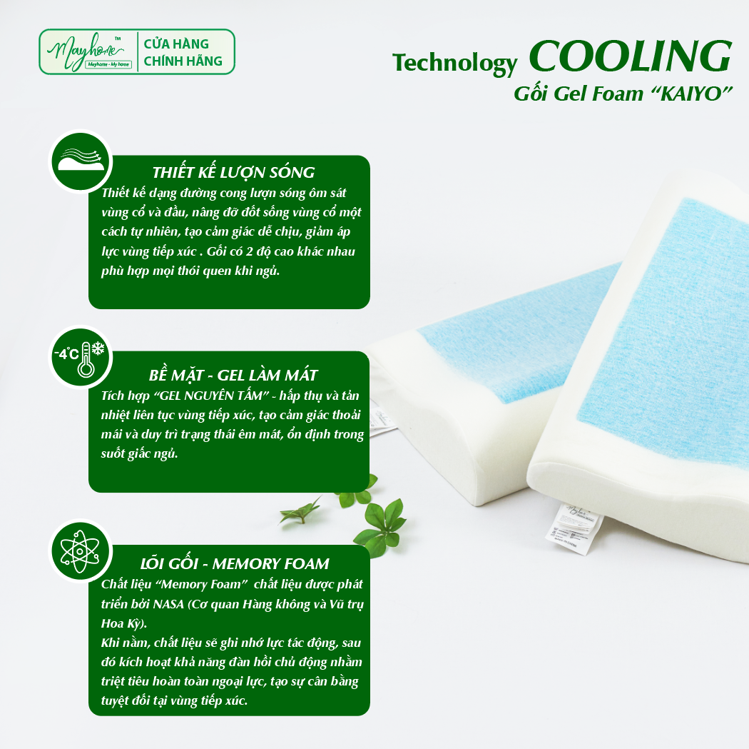 Chất liệu: Ruột gối Foam memory cao cấp, Silicone Gel cân bằng làm mát và Lưới lót 100% Polyester.