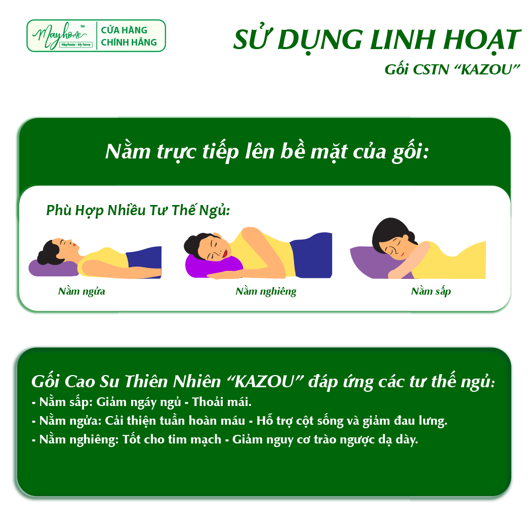 - Thiết kế nguyên khối như những gối cao su thiên nhiên khác. KAZOU là cao su thiên nhiên nguyên khối theo dạng gối thấp, có vòm cong - lõm - kết hợp các lỗ thoáng khí nhằm cố định đốt sống cổ, hai bên vai và đều chỉnh, cân bằng giúp ngủ đúng tư thế.